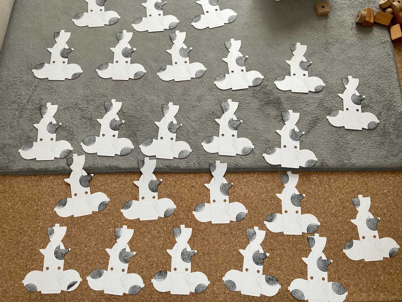いい感じの形になるように何度か試作をしたあと、レーザーカッターで30枚ほど切りました。黒い模様はホームセンターで買った木とスタンプ台で木目が出るように押しています。