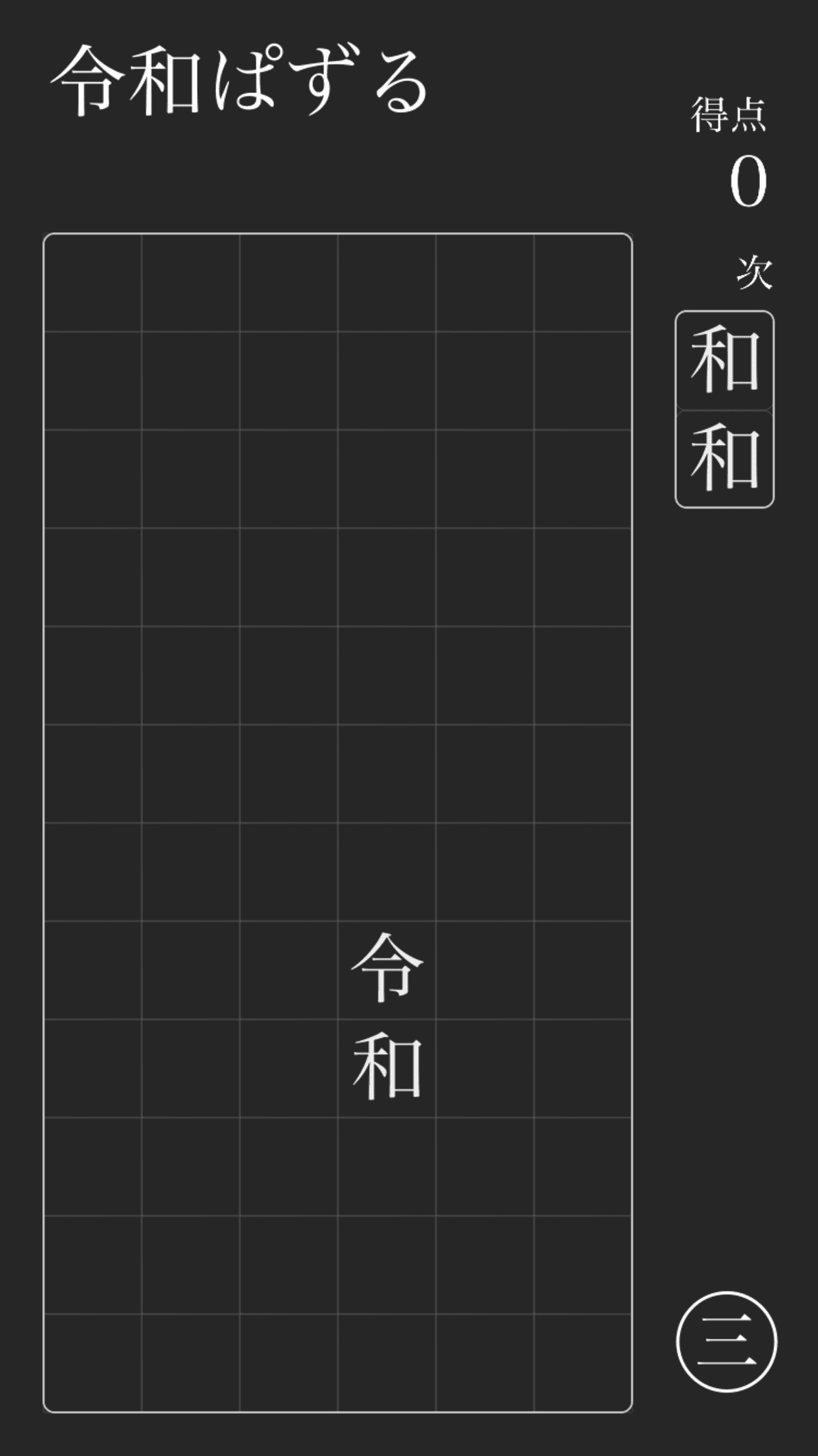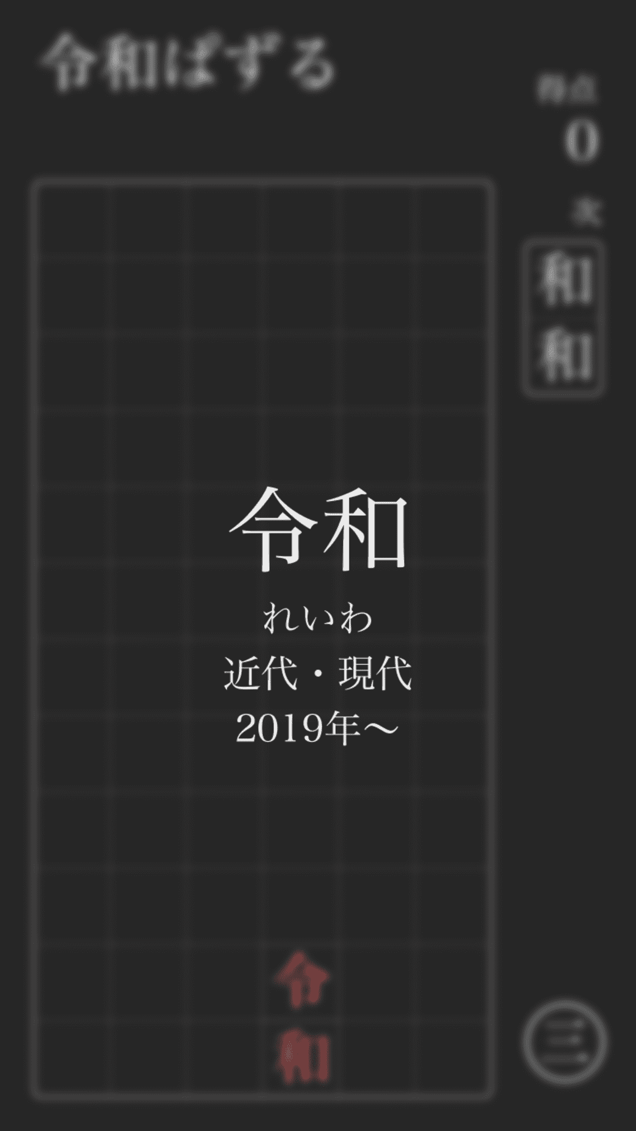 日本の元号を揃えて遊ぶ落ちゲー。左右フリックで移動。タップで回転。揃った元号の年数が長いほど高得点。令和はスペシャルポイント1万点。上まで積み上がるとゲームオーバー。